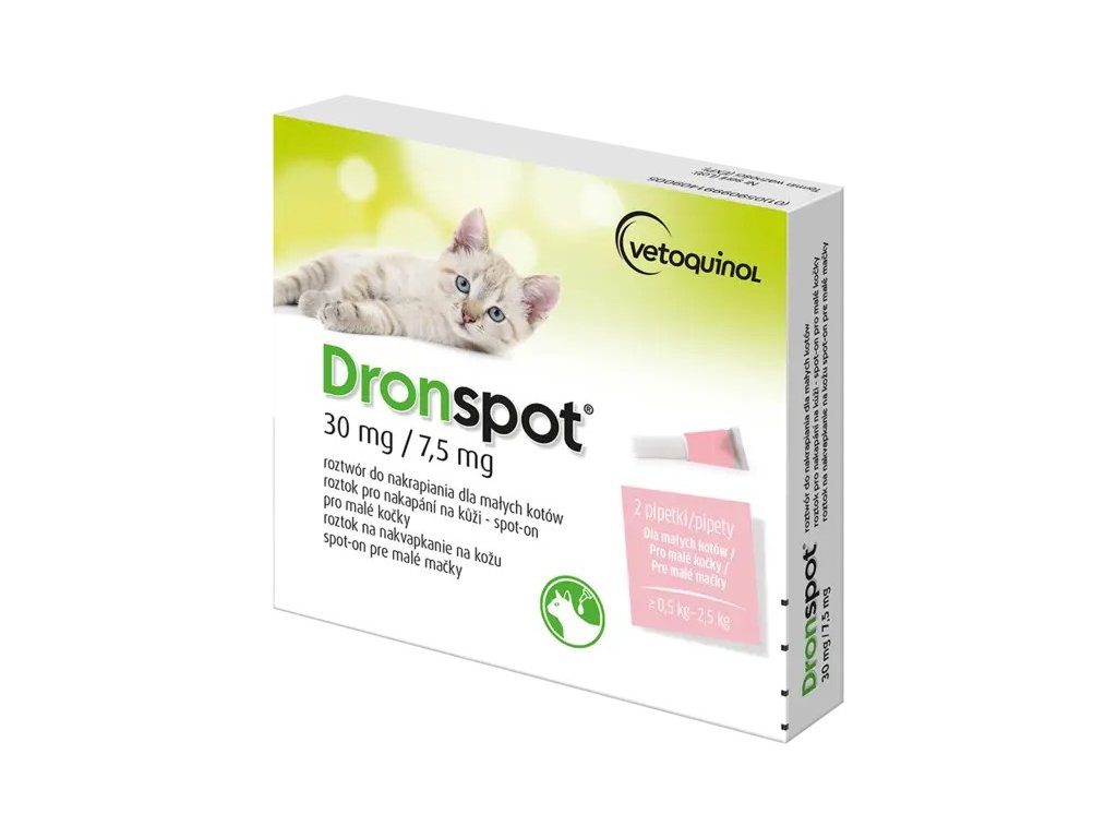 Dronspot 30 mg/7,5 mg Lösung zum Einträufeln auf die Haut = Spot-on für kleine Katzen (0,5–2,5 kg) ist ein Tierarzneimittel gegen die häufigsten inneren Parasiten bei Katzen – Spulwürmer und Plattwürmer (Rundwürmer, Bandwürmer, Hakenwürmer) sowie deren Entwicklungsstadien im Blut und den inneren Organen. Einfache Anwendung mittels Spot-on/Pipette im Nacken. Kombination aus 2 Wirkstoffen (Praziquantel, Emodepsidum). Anwendung während der Trächtigkeit und Laktation möglich. Geeignet ab der 9. Lebenswoche. Für Katzen über 0,5 kg.
