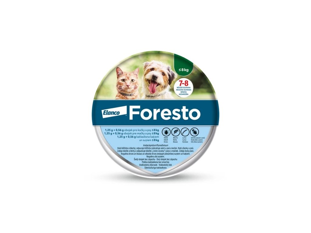 Behandlung und Vorbeugung von Flöhen (Ctenocephalides felis) für 7 bis 8 Monate. Die Wirksamkeit gegen Flöhe beginnt sofort nach dem Anlegen des Halsbandes. Verhindert die Entwicklung von Flohlarven in unmittelbarer Nähe des Tieres für 10 Wochen. Foresto kann im Rahmen der Behandlung von allergischer Flohdermatitis (FAD) angewendet werden. Das Produkt hat eine dauerhafte akarizide (abtötende) Wirkung (Ixodes ricinus, Rhipicephalus turanicus) und eine repellierende (verhindert das Saugen) Wirkung gegen Zecken (Ixodes ricinus) für 8 Monate. Es ist wirksam gegen Larven, Nymphen und erwachsene Zecken.